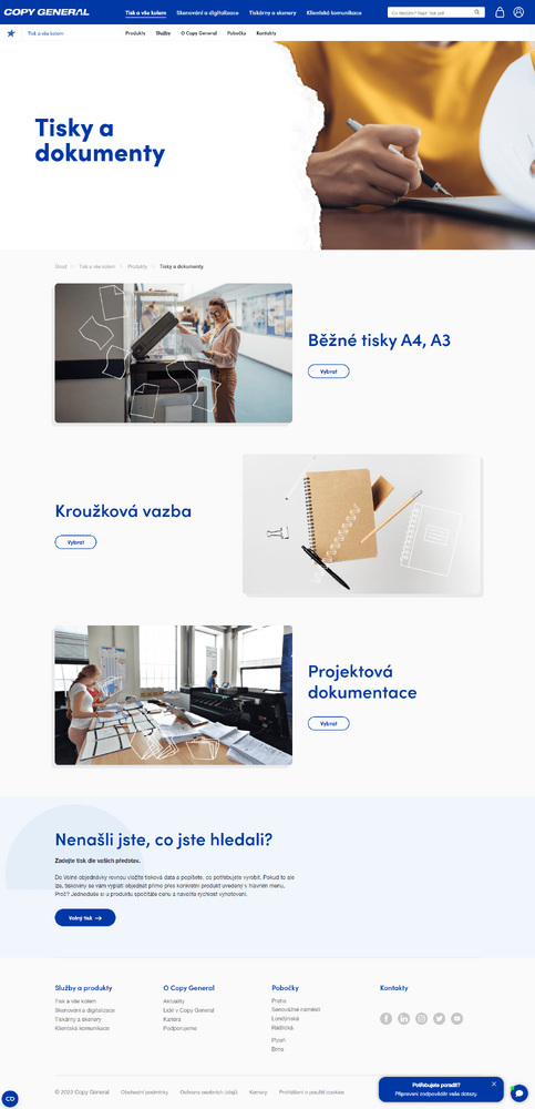 Web Copy General jsme před 4 lety stavěli primárně pro korporátní klienty, jako prezentaci řešení v oblasti tisku, digitalizace či archivace firemních dokumentů. Ne, že byste si na něm nemohli objednat tisk vizitek nebo diplomové práce, jen to nebyla hlavní priorita stránek. V září 2021 jsme spustili redesignovaný web Copy General, který přímému prodeji - a tedy i potřebám koncových klientů - slouží výrazně lépe.